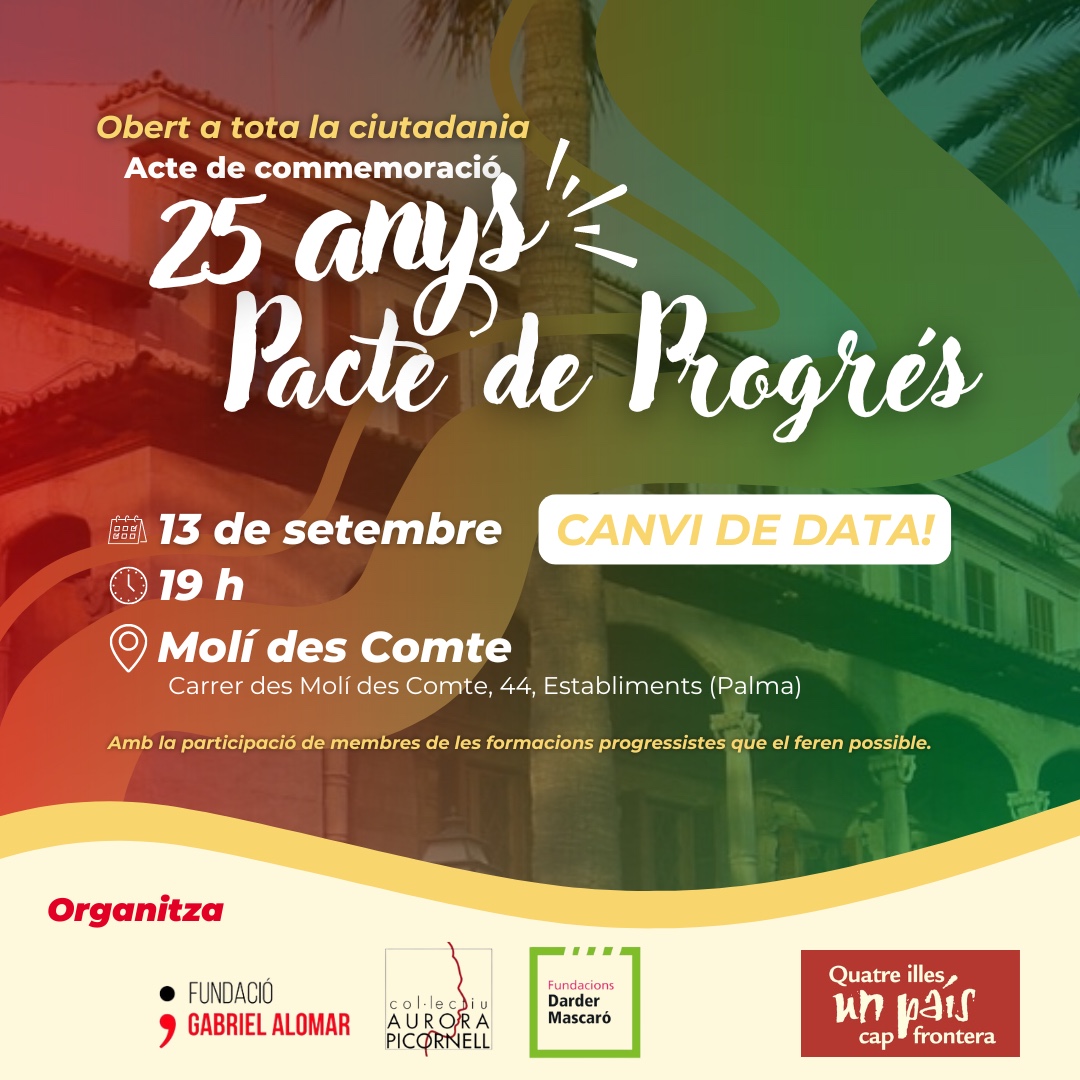 La Fundació Gabriel Alomar, el col·lectiu Aurora Picornell i les Fundacions Darder-Mascaró hem anunciat l’ajornament de l’acte de commemoració dels 25 anys del primer Govern Antich a les Illes Balears. Aquest esdeveniment, que estava programat per al 6 de setembre, es trasllada al 13 de setembre a les 19:00 hores al Molí des Comte. El […]