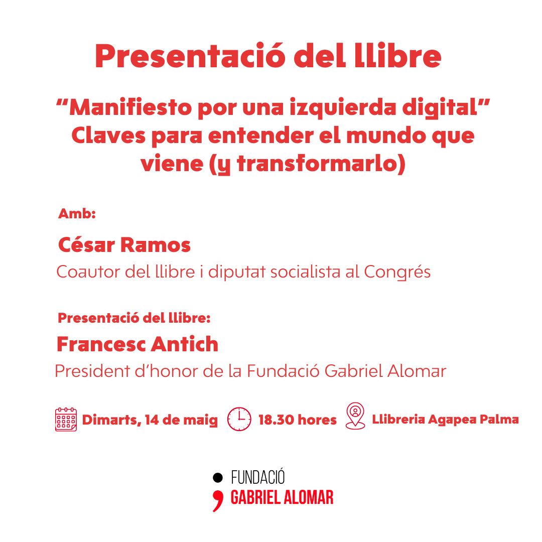 La Fundació Gabriel Alomar presentarà el llibre “Manifest per una esquerra digital” amb el coautor César Ramos i el president d’honor Francesc Antich L’acte se celebrarà a la Llibreria Agapea Palma a les 18:30h organitzat per la Fundació Gabriel Alomar El proper dimarts 14 de maig tindrà lloc la presentació del llibre “Manifest per una […]
